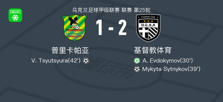北京时间4月25日乌克兰足球甲级联赛 联赛 第25轮,普里卡帕亚主场对阵基督教体育。普里卡帕亚V. Tsyutsyura破门。基督教体育A. Evdokymov破门,Mykyta Sytnykov破门。最终比分普里卡帕亚 1–2 基督教体育。