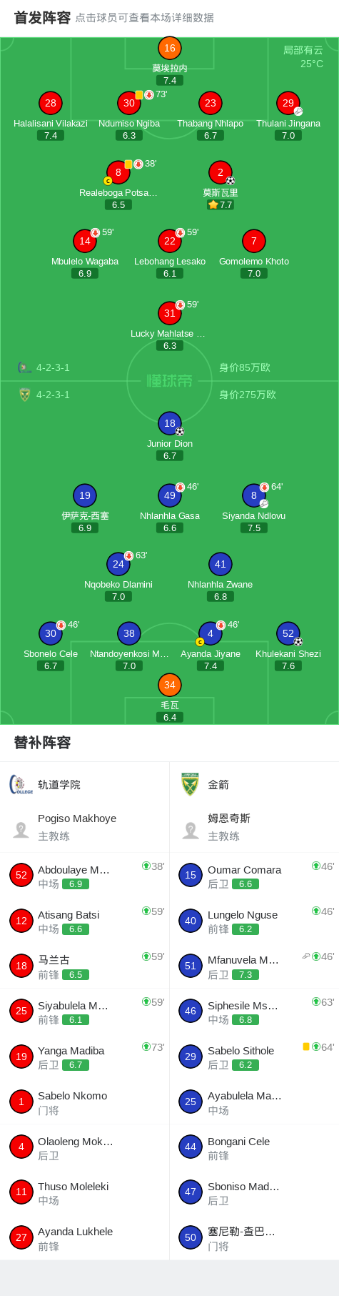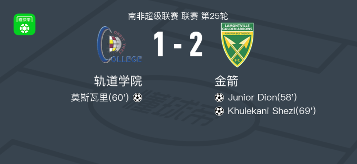 北京时间4月18日南非超级联赛 联赛 第25轮,轨道学院主场对阵金箭。轨道学院莫斯瓦里破门。金箭Junior Dion破门,Khulekani Shezi破门。最终比分轨道学院 1–2 金箭。