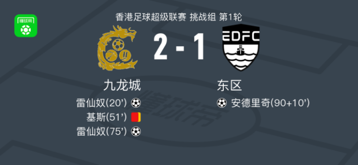 北京时间4月19日香港足球超级联赛 挑战组 第1轮,九龙城主场对阵东区。九龙城雷仙奴梅开二度。东区安德里奇破门。最终比分九龙城 21 东区。