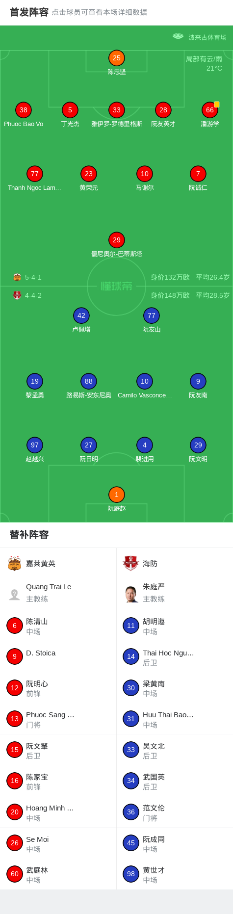 嘉莱黄英0-0海防,平分秋色 足球资讯 发布时间: 2026年4月24日 阅读时间: 少于1 分钟 FacebookXPinterestWhatsApp 嘉莱黄英0-0海防,平分秋色 北京时间4月24日越南足球联赛 联赛 第20轮,嘉莱黄英主场对阵海防。最终比分嘉莱黄英 0–0 海防。 点击查看本场比赛详细数据>> 点击查看越南联完整积分榜>> 球队阵容 技术统计 FacebookXPinterestWhatsApp 1823100https://1823100.com 红单推荐 023 英超 阿森纳vs纽卡斯尔 红单推荐 2026年4月25日 016 英超 狼队vs热刺 红单推荐 2026年4月25日 013 英超 桑德兰vs诺丁汉 红单推荐 2026年4月24日 014 西甲 贝蒂斯vs皇马 红单推荐 2026年4月24日 005 西甲 巴列卡诺vs西班牙人 红单推荐 2026年4月23日 热门资讯 012 英超 诺丁汉森林vs阿斯顿维拉 红单推荐 2026年4月12日 002 欧联 诺丁汉vs波尔图 红单推荐 2026年4月16日 三人20+!火箭21分逆转太阳7连胜 KD24分阿门22+11+8 篮球资讯 2026年4月8日 约基奇第198次三双!掘金大胜灰熊豪取10连胜 穆雷26+7+5 篮球资讯 2026年4月9日 016 英超 狼队vs热刺 红单推荐 2026年4月25日