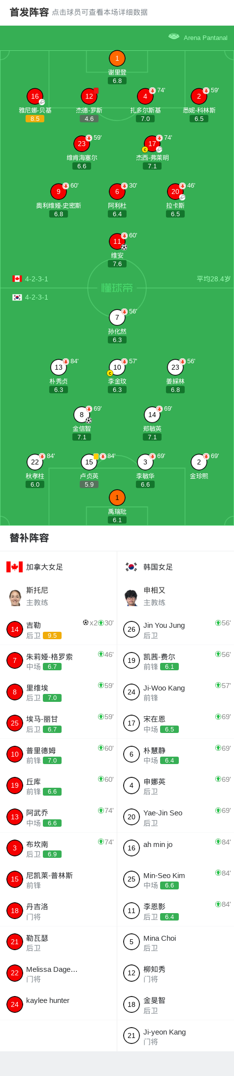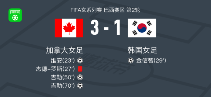 北京时间4月15日FIFA女系列赛 巴西赛区 第2轮,加拿大女足对阵韩国女足。加拿大女足维安破门,吉勒梅开二度。韩国女足金信智破门。最终比分加拿大女足 31 韩国女足。