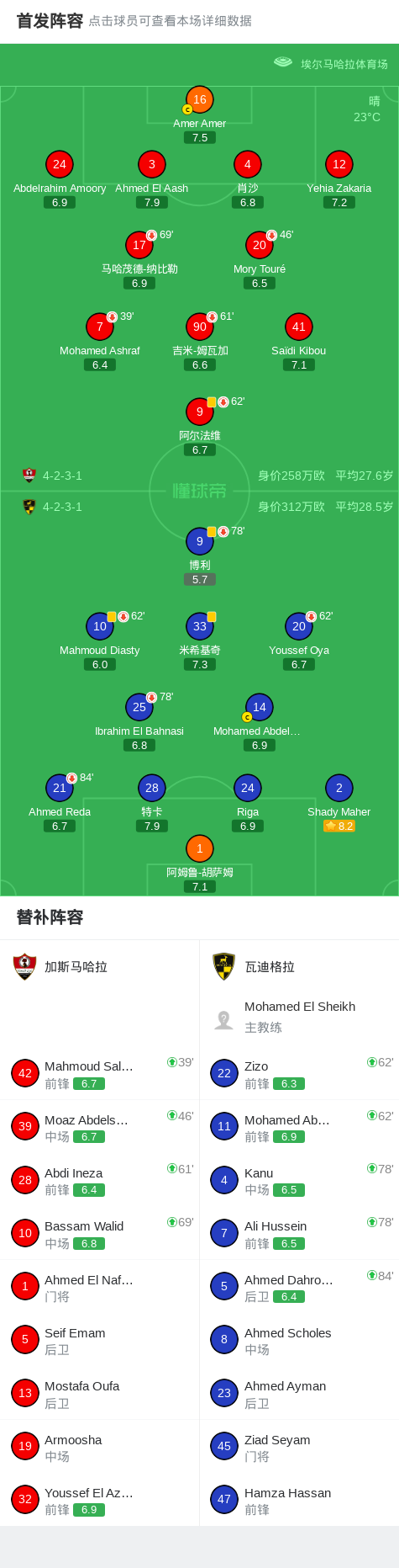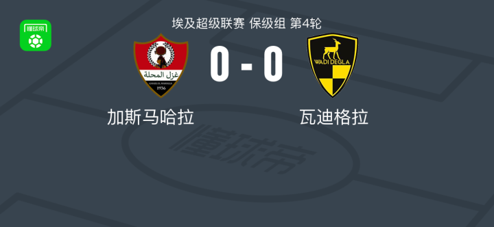 北京时间4月13日埃及超级联赛 保级组 第4轮,加斯马哈拉主场对阵瓦迪格拉。最终比分加斯马哈拉 0–0 瓦迪格拉。