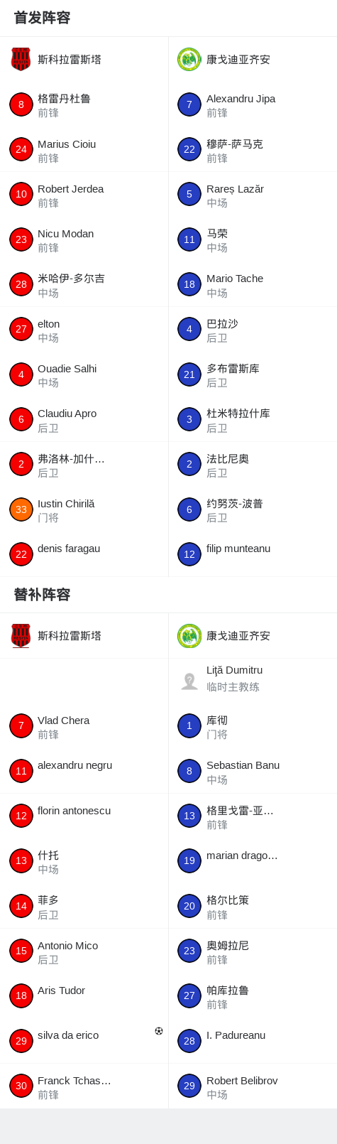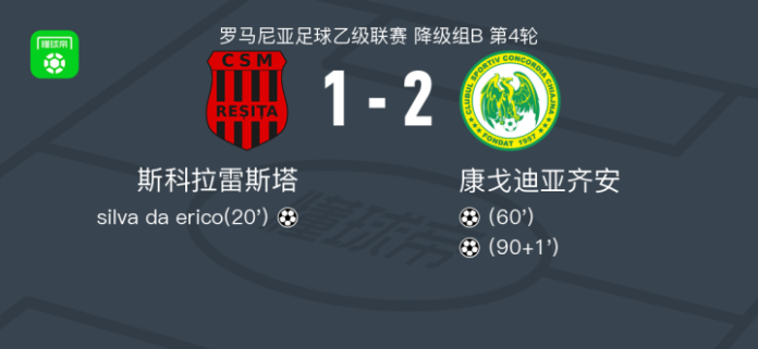 北京时间4月18日罗马尼亚足球乙级联赛 降级组B 第4轮,斯科拉雷斯塔主场对阵康戈迪亚齐安。斯科拉雷斯塔silva da erico破门。最终比分斯科拉雷斯塔 12 康戈迪亚齐安。