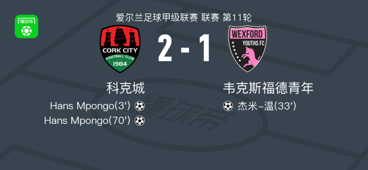 北京时间4月18日爱尔兰足球甲级联赛 联赛 第11轮,科克城主场对阵韦克斯福德青年。科克城Hans Mpongo梅开二度。韦克斯福德青年杰米-温破门。最终比分科克城 2–1 韦克斯福德青年。