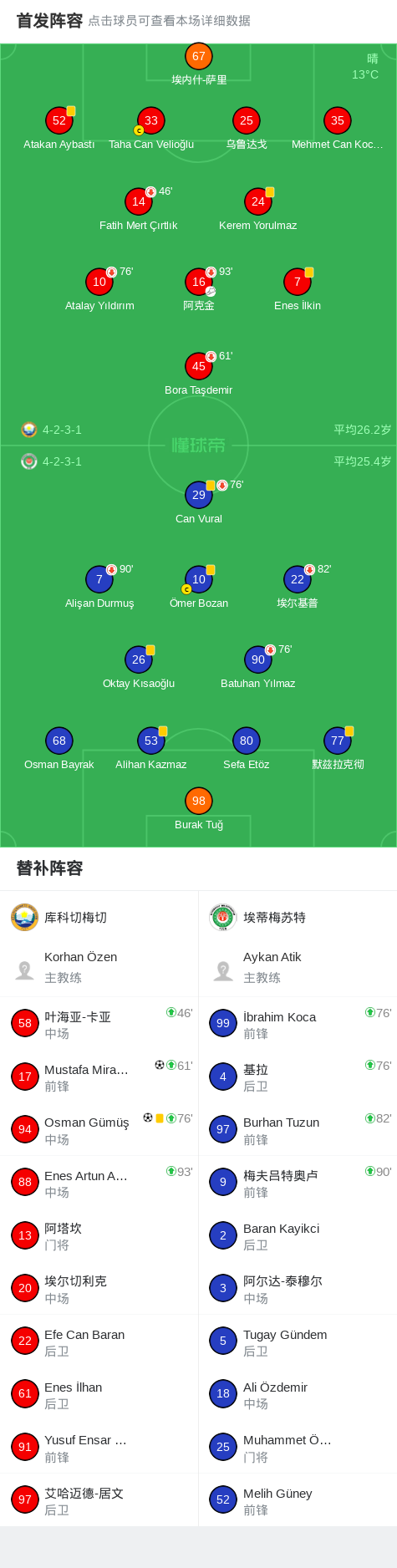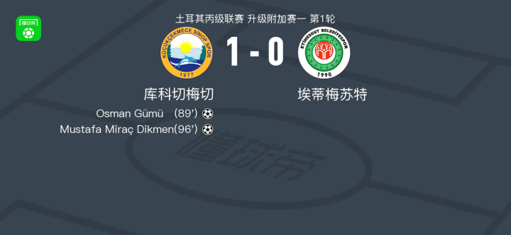 北京时间4月27日土耳其丙级联赛 升级附加赛一 第1轮,库科切梅切主场对阵埃蒂梅苏特。库科切梅切Osman Gümüş破门,Mustafa Miraç Dikmen破门。最终比分库科切梅切 1–0 埃蒂梅苏特。