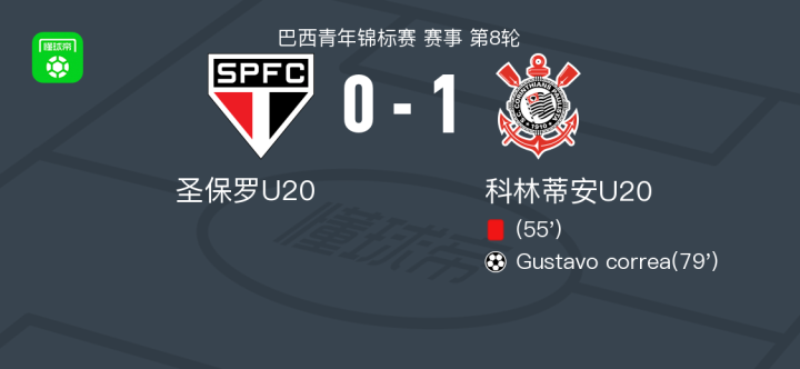 北京时间4月27日巴西青年锦标赛 赛事 第8轮,圣保罗U20对阵科林蒂安U20。科林蒂安U20Gustavo correa破门。最终比分圣保罗U20 0–1 科林蒂安U20。