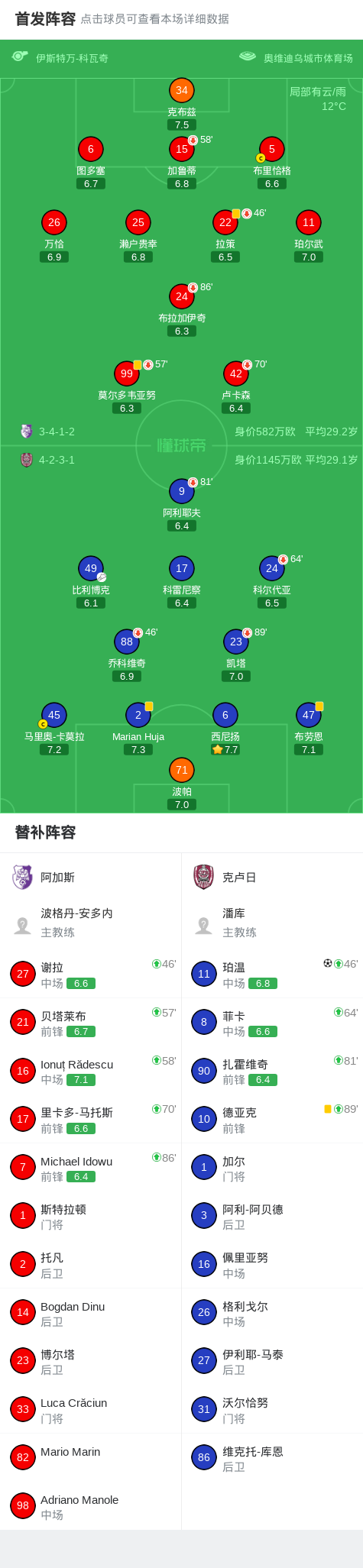 克卢日1-0阿加斯,珀温一剑封喉 足球资讯 发布时间: 2026年4月18日 阅读时间: 少于1 分钟 FacebookXPinterestWhatsApp 克卢日1-0阿加斯,珀温一剑封喉 北京时间4月18日罗马尼亚足球甲级联赛 争冠组 第5轮,阿加斯主场对阵克卢日。克卢日珀温破门。最终比分阿加斯 0–1 克卢日。 点击查看本场比赛详细数据>> 点击查看罗甲完整积分榜>> 精彩瞬间 下半场补时第3分钟,克卢日球员比利博克助攻珀温打入一球。 球队阵容 技术统计 FacebookXPinterestWhatsApp 1823100https://1823100.com 红单推荐 007 意杯 国际米兰vs科莫 红单推荐 2026年4月21日 005 西甲 毕尔巴鄂竞技vs奥萨苏纳 红单推荐 2026年4月21日 001 意甲 莱切vs佛罗伦萨 红单推荐 2026年4月20日 003 英超 水晶宫vs西汉姆联 红单推荐 2026年4月20日 019 英超 曼城vs阿森纳 红单推荐 2026年4月19日 热门资讯 023 英超 利物浦vs富勒姆 红单推荐 2026年4月11日 019 英超 曼城vs阿森纳 红单推荐 2026年4月19日 007 意杯 国际米兰vs科莫 红单推荐 2026年4月21日 007 英冠 伊普斯维奇vs米德尔斯堡 红单推荐 2026年4月19日 005 英超 曼联vs利兹联 红单推荐 2026年4月13日