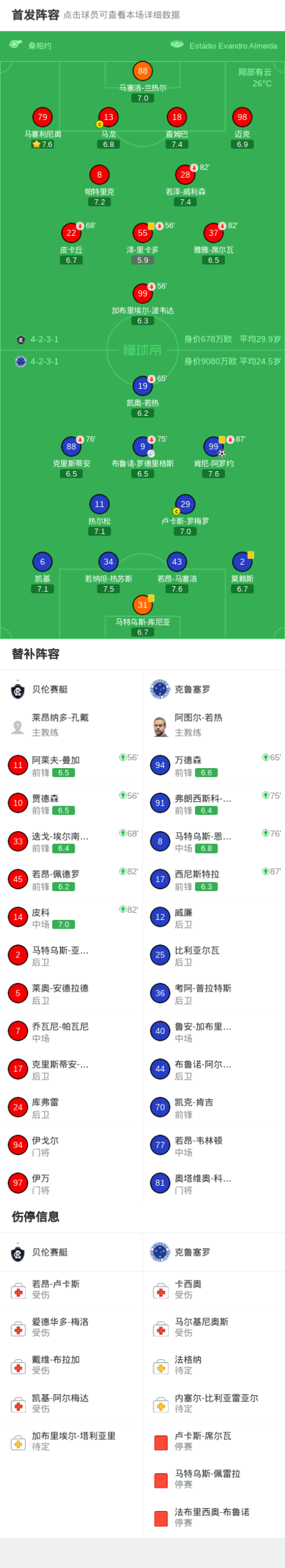 克鲁塞罗1-0贝伦赛艇,肯尼-阿罗约制胜 足球资讯 发布时间: 2026年4月26日 阅读时间: 少于1 分钟 FacebookXPinterestWhatsApp 克鲁塞罗1-0贝伦赛艇,肯尼-阿罗约制胜 北京时间4月26日巴西足球甲级联赛 联赛 第13轮,贝伦赛艇主场对阵克鲁塞罗。克鲁塞罗肯尼-阿罗约破门。最终比分贝伦赛艇 0–1 克鲁塞罗。 点击查看本场比赛详细数据>> 点击查看巴甲完整积分榜>> 精彩瞬间 第34分钟,克鲁塞罗球员布鲁诺-罗德里格斯助攻肯尼-阿罗约打入一球。 球队阵容 技术统计 FacebookXPinterestWhatsApp 1823100https://1823100.com 红单推荐 023 英超 阿森纳vs纽卡斯尔 红单推荐 2026年4月25日 016 英超 狼队vs热刺 红单推荐 2026年4月25日 013 英超 桑德兰vs诺丁汉 红单推荐 2026年4月24日 014 西甲 贝蒂斯vs皇马 红单推荐 2026年4月24日 005 西甲 巴列卡诺vs西班牙人 红单推荐 2026年4月23日 热门资讯 三人20+!火箭21分逆转太阳7连胜 KD24分阿门22+11+8 篮球资讯 2026年4月8日 004 欧冠 巴萨vs马竞 红单推荐 2026年4月8日 约基奇第198次三双!掘金大胜灰熊豪取10连胜 穆雷26+7+5 篮球资讯 2026年4月9日 002 欧协联 巴列卡诺vs雅典AEK 红单推荐 2026年4月9日 003 欧冠 利物浦vs巴黎圣日耳曼 红单推荐 2026年4月14日