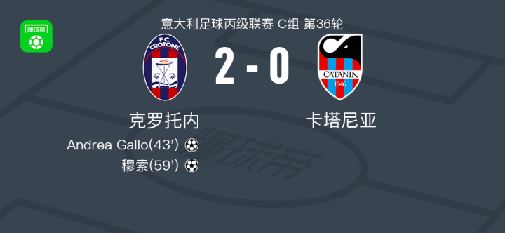 北京时间4月14日意大利足球丙级联赛 C组 第36轮,克罗托内主场对阵卡塔尼亚。克罗托内Andrea Gallo破门,穆索破门。最终比分克罗托内 2–0 卡塔尼亚。