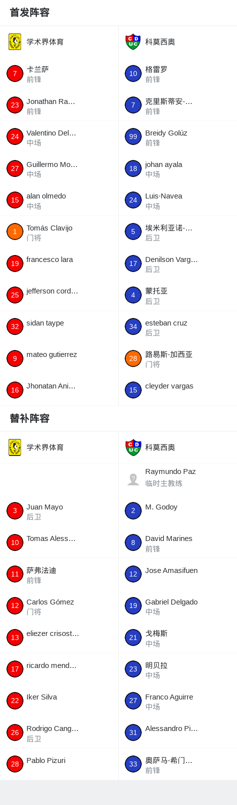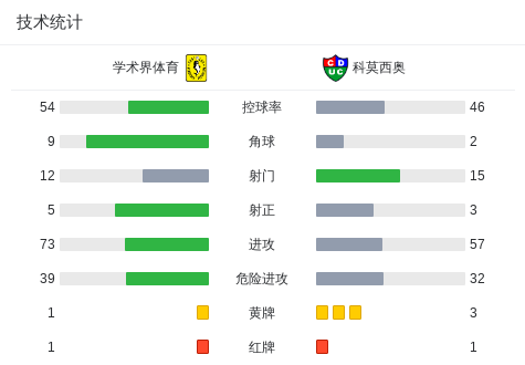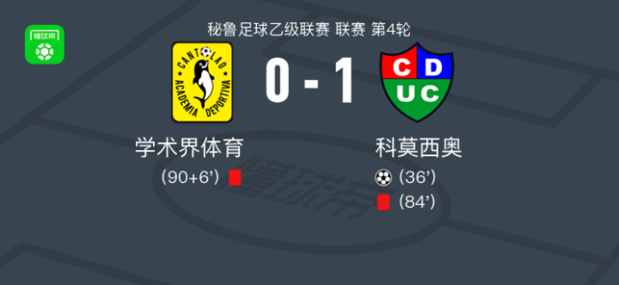 科莫西奥1-0学术界体育 足球资讯 发布时间: 2026年4月27日 阅读时间: 少于1 分钟 FacebookXPinterestWhatsApp 科莫西奥1-0学术界体育 北京时间4月27日秘鲁足球乙级联赛 联赛 第4轮,学术界体育主场对阵科莫西奥。最终比分学术界体育 0–1 科莫西奥。 点击查看本场比赛详细数据>> 精彩瞬间 第36分钟,科莫西奥球员打入一球。 第84分钟,科莫西奥球队吃到红牌。 下半场补时第6分钟,学术界体育球队吃到红牌。 球队阵容 技术统计 FacebookXPinterestWhatsApp 1823100https://1823100.com 红单推荐 021 西甲 奥萨苏纳vs塞维利亚 红单推荐 2026年4月26日 013 英足总杯 切尔西(中)vs利兹联 红单推荐 2026年4月26日 023 英超 阿森纳vs纽卡斯尔 红单推荐 2026年4月25日 016 英超 狼队vs热刺 红单推荐 2026年4月25日 013 英超 桑德兰vs诺丁汉 红单推荐 2026年4月24日 热门资讯 官方:贺希宁当选本赛季CBA常规赛MVP 篮球资讯 2026年4月26日 阿贾克斯女足0-0费耶诺德女足,秋色平分 足球资讯 2026年4月26日 阿拉德纺织厂0-0康斯坦察灯塔,平分秋色 足球资讯 2026年4月26日 马竞官方:巴里奥斯左大腿肌肉受伤,回归时间取决于恢复情况 足球资讯 2026年4月26日 官方:上海队主帅卢伟当选本赛季CBA常规赛最佳教练员 篮球资讯 2026年4月26日