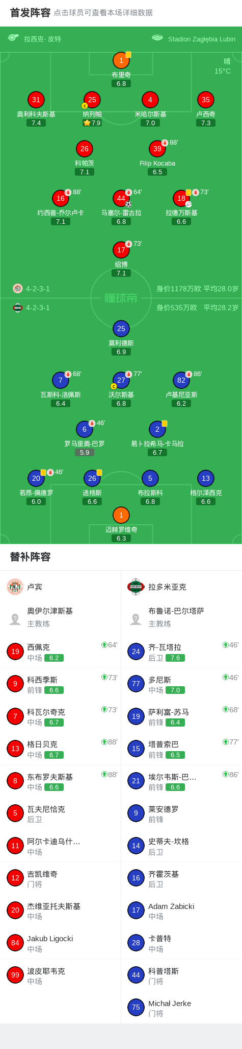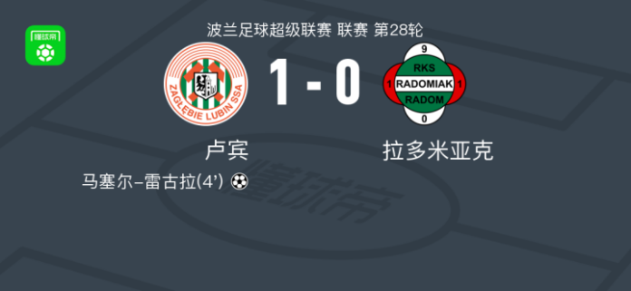 卢宾1-0拉多米亚克,马塞尔-雷古拉一剑封喉 足球资讯 发布时间: 2026年4月12日 阅读时间: 少于1 分钟 FacebookXPinterestWhatsApp 卢宾1-0拉多米亚克,马塞尔-雷古拉一剑封喉 北京时间4月11日波兰足球超级联赛 联赛 第28轮,卢宾主场对阵拉多米亚克。卢宾马塞尔-雷古拉破门。最终比分卢宾 1–0 拉多米亚克。 点击查看本场比赛详细数据>> 点击查看波兰超完整积分榜>> 精彩瞬间 第4分钟,卢宾球员拉德万斯基助攻马塞尔-雷古拉打入一球。 球队阵容 技术统计 FacebookXPinterestWhatsApp 1823100https://1823100.com 红单推荐 001 意甲 莱切vs佛罗伦萨 红单推荐 2026年4月20日 003 英超 水晶宫vs西汉姆联 红单推荐 2026年4月20日 019 英超 曼城vs阿森纳 红单推荐 2026年4月19日 007 英冠 伊普斯维奇vs米德尔斯堡 红单推荐 2026年4月19日 009 挪超 博德闪耀vs奥勒松 红单推荐 2026年4月18日 热门资讯 雷帕斯3-2逆转基芬,oliver helttunen、Timur Saltykov破门 足球资讯 2026年4月19日 002 欧联 诺丁汉vs波尔图 红单推荐 2026年4月16日 001 欧联杯 塞尔塔vs弗莱堡 红单推荐 2026年4月16日 还能这么玩,奥德里奥索拉夺冠后把女儿塞进了国王杯奖杯里 足球资讯 2026年4月20日 马竞官方:为避免受伤,卢克曼和瑟洛特暂时进行单独训练 足球资讯 2026年4月20日