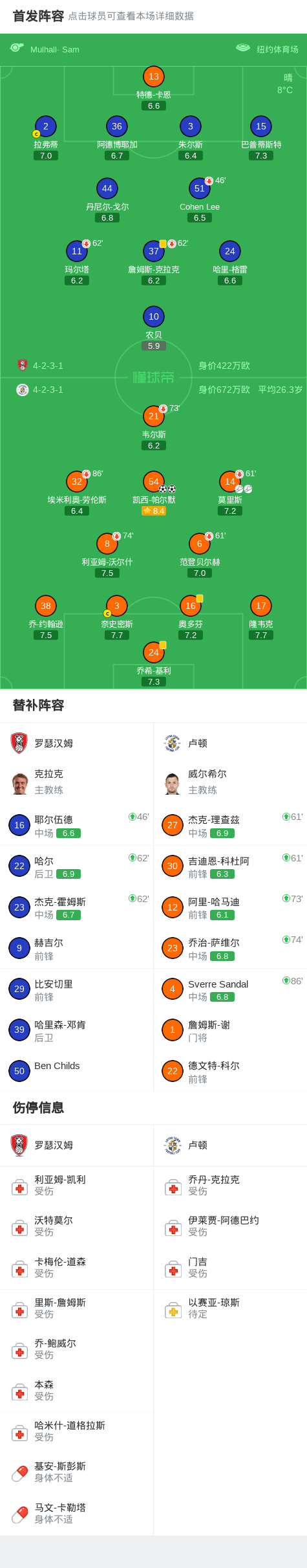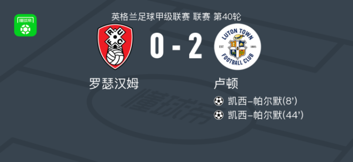 卢顿2-0罗瑟汉姆,凯西-帕尔默包办2球 足球资讯 发布时间: 2026年4月22日 阅读时间: 少于1 分钟 FacebookXPinterestWhatsApp 卢顿2-0罗瑟汉姆,凯西-帕尔默包办2球 北京时间4月22日英格兰足球甲级联赛 联赛 第40轮,罗瑟汉姆主场对阵卢顿。卢顿凯西-帕尔默梅开二度。最终比分罗瑟汉姆 0–2 卢顿。 点击查看本场比赛详细数据>> 点击查看英甲完整积分榜>> 精彩瞬间 第8分钟,卢顿球员莫里斯助攻凯西-帕尔默打入一球。 第44分钟,卢顿球员莫里斯助攻凯西-帕尔默打入一球。 球队阵容 技术统计 FacebookXPinterestWhatsApp 1823100https://1823100.com 红单推荐 007 意杯 国际米兰vs科莫 红单推荐 2026年4月21日 005 西甲 毕尔巴鄂竞技vs奥萨苏纳 红单推荐 2026年4月21日 001 意甲 莱切vs佛罗伦萨 红单推荐 2026年4月20日 003 英超 水晶宫vs西汉姆联 红单推荐 2026年4月20日 019 英超 曼城vs阿森纳 红单推荐 2026年4月19日 热门资讯 023 英超 利物浦vs富勒姆 红单推荐 2026年4月11日 005 英超 曼联vs利兹联 红单推荐 2026年4月13日 019 英超 曼城vs阿森纳 红单推荐 2026年4月19日 007 意杯 国际米兰vs科莫 红单推荐 2026年4月21日 007 英冠 伊普斯维奇vs米德尔斯堡 红单推荐 2026年4月19日