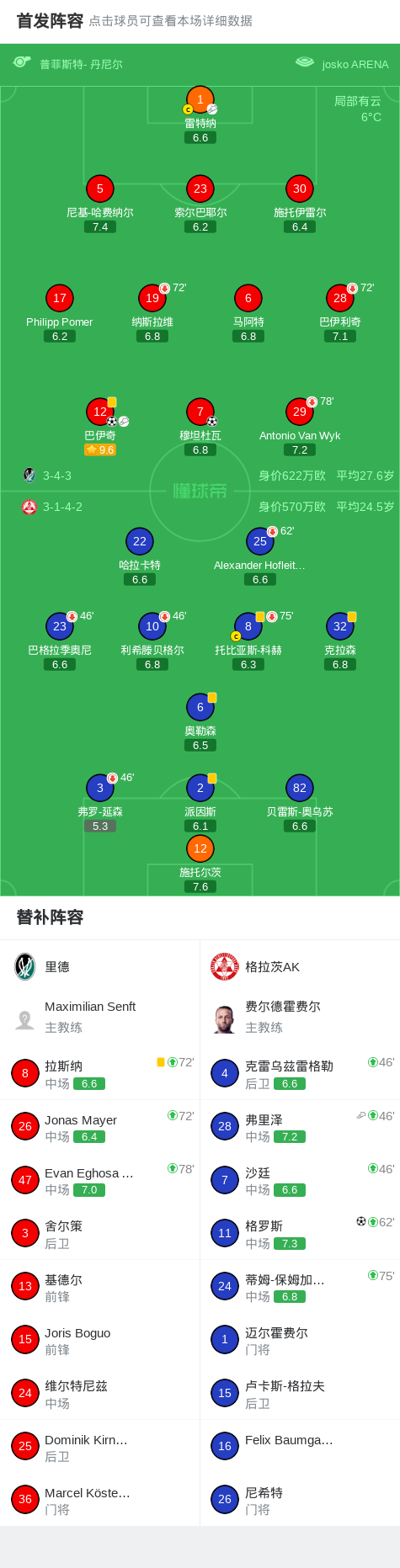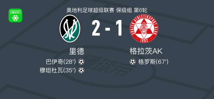 北京时间4月22日奥地利足球超级联赛 保级组 第6轮,里德主场对阵格拉茨AK。里德巴伊奇破门,穆坦杜瓦破门。格拉茨AK格罗斯破门。最终比分里德 2–1 格拉茨AK。