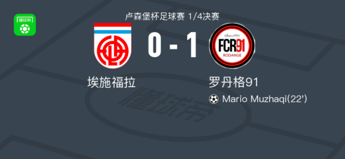 北京时间4月23日卢森堡杯足球赛 1/4决赛,埃施福拉对阵罗丹格91。罗丹格91Mario Muzhaqi破门。最终比分埃施福拉 0–1 罗丹格91。