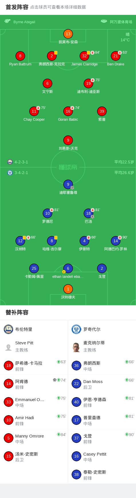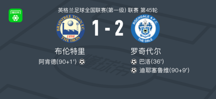 北京时间4月19日英格兰足球全国联赛(第一级) 联赛 第45轮,布伦特里主场对阵罗奇代尔。布伦特里阿肯德破门。罗奇代尔巴洛破门,迪耶塞鲁维破门。最终比分布伦特里 1–2 罗奇代尔。