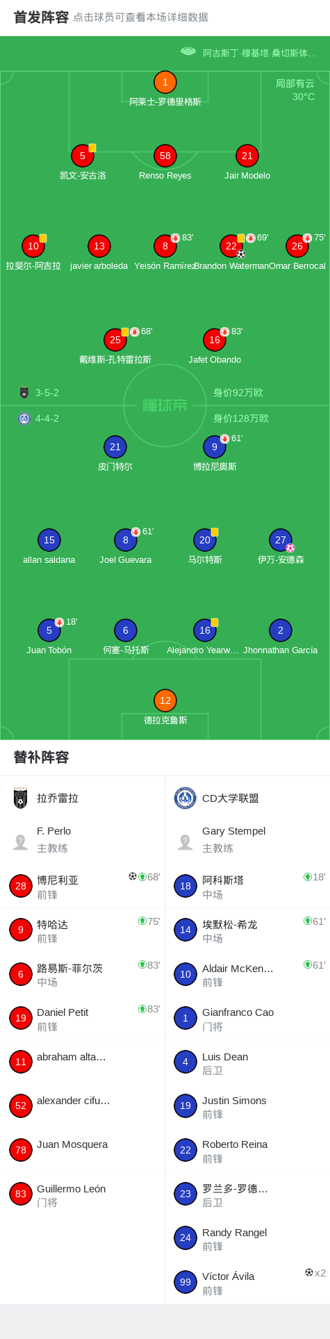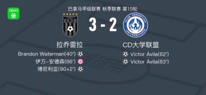北京时间4月27日巴拿马甲级联赛 秋季联赛 第15轮,拉乔雷拉主场对阵CD大学联盟。拉乔雷拉Brandon Waterman破门,博尼利亚破门。CD大学联盟Víctor Ávila梅开二度,伊万-安德森自摆乌龙。最终比分拉乔雷拉 32 CD大学联盟。
