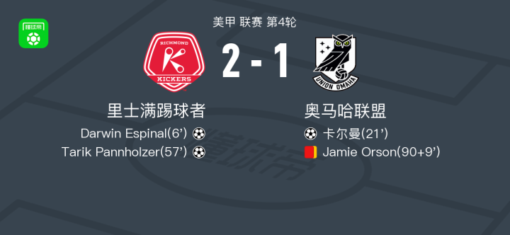 北京时间4月19日美甲 联赛 第4轮,里士满踢球者对阵奥马哈联盟。里士满踢球者Darwin Espinal破门,Tarik Pannholzer破门。奥马哈联盟卡尔曼破门。最终比分里士满踢球者 21 奥马哈联盟。