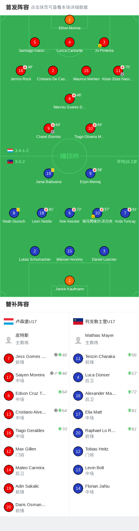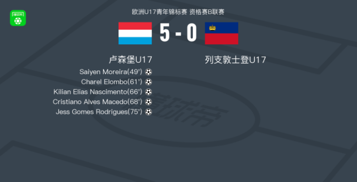 北京时间4月25日欧洲U17青年锦标赛 资格赛B联赛,卢森堡U17对阵列支敦士登U17。卢森堡U17Saiyen Moreira破门,Charel Elombo破门,Kilian Elias Nascimento破门,Cristiano Alves Macedo破门,Jess Gomes Rodrigues破门。最终比分卢森堡U17 5–0 列支敦士登U17。