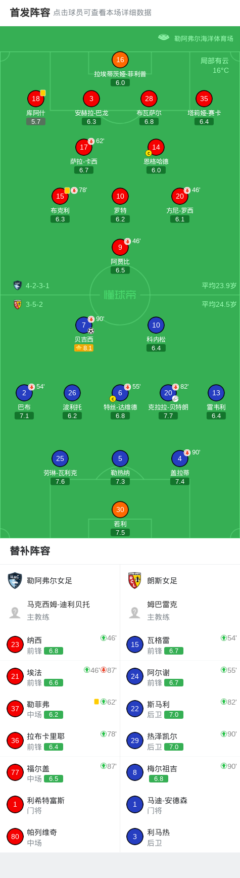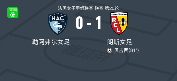 朗斯女足1-0勒阿弗尔女足,贝吉西绝杀 足球资讯 发布时间: 2026年4月23日 阅读时间: 少于1 分钟 FacebookXPinterestWhatsApp 朗斯女足1-0勒阿弗尔女足,贝吉西绝杀 北京时间4月23日法国女子甲组联赛 联赛 第20轮,勒阿弗尔女足主场对阵朗斯女足。朗斯女足贝吉西破门。最终比分勒阿弗尔女足 0–1 朗斯女足。 点击查看本场比赛详细数据>> 点击查看法女甲完整积分榜>> 精彩瞬间 第81分钟,朗斯女足球员克拉拉-贝特朗助攻贝吉西打入一球。 球队阵容 技术统计 FacebookXPinterestWhatsApp 1823100https://1823100.com 红单推荐 005 西甲 巴列卡诺vs西班牙人 红单推荐 2026年4月23日 003 西甲 莱万特vs塞维利亚 红单推荐 2026年4月23日 015 西甲 巴萨vs塞尔塔 红单推荐 2026年4月22日 012 英超 伯恩茅斯vs利兹联 红单推荐 2026年4月22日 007 意杯 国际米兰vs科莫 红单推荐 2026年4月21日 热门资讯 萨拉戈萨U19 0-0乌德山U19,双方握手言和 足球资讯 2026年4月12日 007 英冠 伊普斯维奇vs米德尔斯堡 红单推荐 2026年4月19日 019 英超 曼城vs阿森纳 红单推荐 2026年4月19日 三人20+!火箭21分逆转太阳7连胜 KD24分阿门22+11+8 篮球资讯 2026年4月8日 萨拉赫英超打入157粒非点球进球,追平阿圭罗列历史第五 足球资讯 2026年4月12日