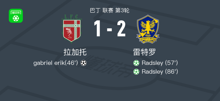 北京时间4月19日巴丁 联赛 第3轮,拉加托主场对阵雷特罗。拉加托gabriel erik破门。雷特罗Radsley 梅开二度。最终比分拉加托 1–2 雷特罗。