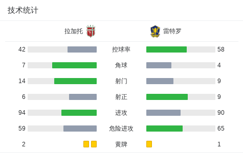 第46分钟,拉加托球员gabriel erik打入一球。