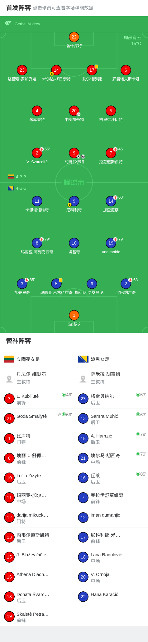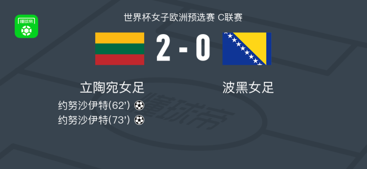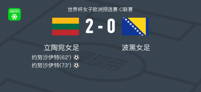 北京时间4月14日世界杯女子欧洲预选赛 C联赛,立陶宛女足对阵波黑女足。立陶宛女足约努沙伊特梅开二度。最终比分立陶宛女足 2–0 波黑女足。