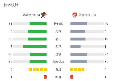 下半场补时第7分钟,莱雄伊什U23球队吃到红牌。