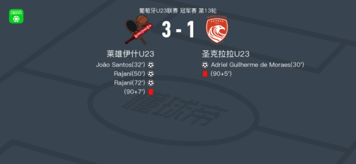 北京时间4月21日葡萄牙U23联赛 冠军赛 第13轮,莱雄伊什U23主场对阵圣克拉拉U23。莱雄伊什U23João Santos破门,Rajani梅开二度。圣克拉拉U23Adriel Guilherme de Moraes破门。最终比分莱雄伊什U23 3–1 圣克拉拉U23。
