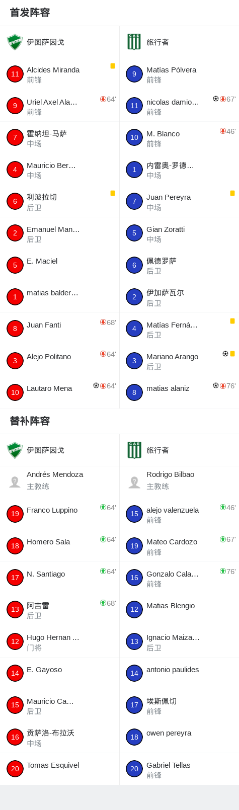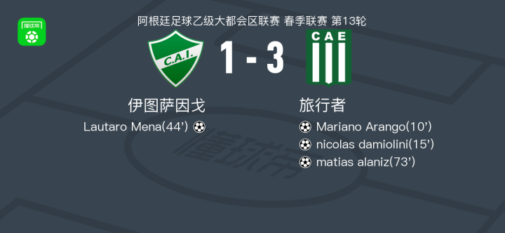 北京时间4月26日阿根廷足球乙级大都会区联赛 春季联赛 第13轮,伊图萨因戈主场对阵旅行者。伊图萨因戈Lautaro Mena破门。旅行者Mariano Arango破门,nicolas damiolini破门,matias alaniz破门。最终比分意杜萨高 1–3 旅行者。