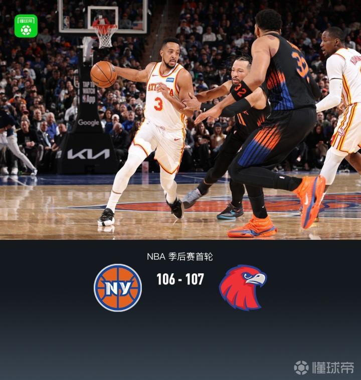 北京时间4月21日NBA 季后赛首轮G2,纽约尼克斯主场迎战亚特兰大老鹰。首节尼克斯便取得9分领先,半场尼克斯61-54老鹰,三节结束尼克斯领先12分,末节老鹰强势反扑最后阶段完成反超,最后关键时刻老鹰领先1分,麦科勒姆两罚不中,尼克斯布里奇斯中投错失绝杀,最终老鹰107-106尼克斯,大比分1-1追平。