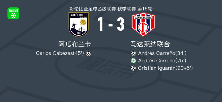 北京时间4月19日哥伦比亚足球乙级联赛 秋季联赛 第15轮,阿瓜布兰卡主场对阵马达莱纳联合。阿瓜布兰卡Carlos Cabezas破门。马达莱纳联合Andrés Carreño梅开二度,Cristian Iguarán破门。最终比分阿瓜布兰卡 1–3 马达莱纳联合。