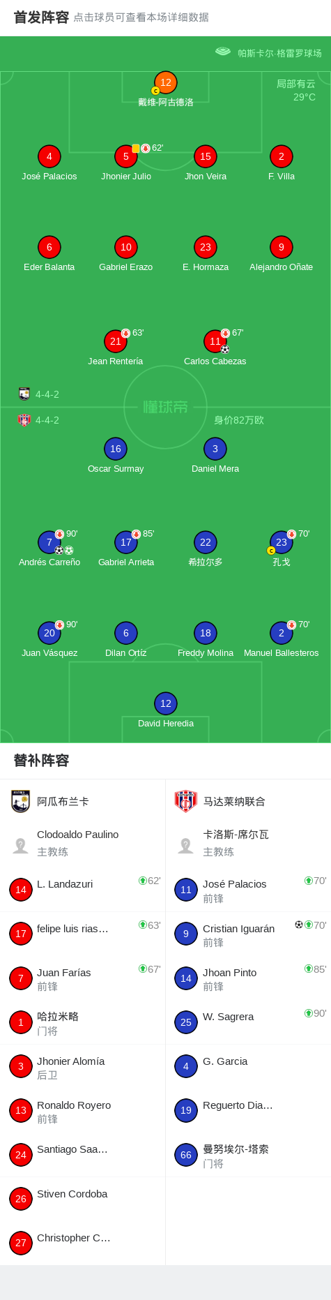 第34分钟,马达莱纳联合球员Andrés Carreño打入一球。