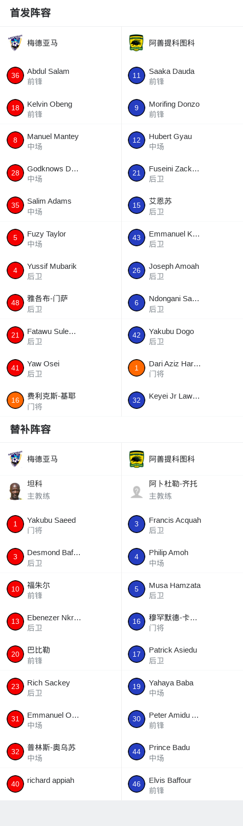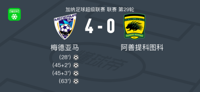 北京时间4月12日加纳足球超级联赛 联赛 第29轮,梅德亚马主场对阵阿善提科图科。最终比分梅德亚马 4–0 阿善提科图科。