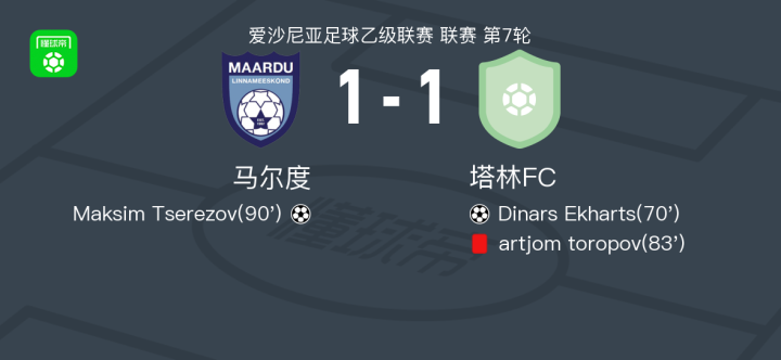北京时间4月24日爱沙尼亚足球乙级联赛 联赛 第7轮,马尔度主场对阵塔林FC。马尔度Maksim Tserezov破门。塔林FCDinars Ekharts破门。最终比分马尔度伊斯特夫 11 塔林FC。