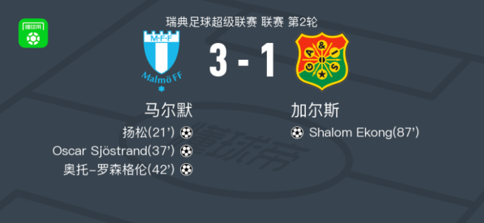 第21分钟,马尔默球员斯特里格-拉森助攻扬松打入一球。