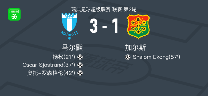 北京时间4月12日瑞典足球超级联赛 联赛 第2轮,马尔默主场对阵加尔斯。马尔默扬松破门,Oscar Sjöstrand破门,奥托-罗森格伦破门。加尔斯Shalom Ekong破门。最终比分马尔默 3–1 加尔斯。