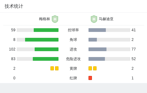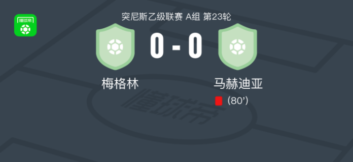 梅格林0-0马赫迪亚,双方互有攻守 足球资讯 发布时间: 2026年4月19日 阅读时间: 少于1 分钟 FacebookXPinterestWhatsApp 梅格林0-0马赫迪亚,双方互有攻守 北京时间4月18日突尼斯乙级联赛 A组 第23轮,梅格林主场对阵马赫迪亚。最终比分梅格林 0–0 马赫迪亚。 点击查看本场比赛详细数据>> 精彩瞬间 第80分钟,马赫迪亚球队吃到红牌。 技术统计 FacebookXPinterestWhatsApp 1823100https://1823100.com 红单推荐 013 英超 桑德兰vs诺丁汉 红单推荐 2026年4月24日 014 西甲 贝蒂斯vs皇马 红单推荐 2026年4月24日 005 西甲 巴列卡诺vs西班牙人 红单推荐 2026年4月23日 003 西甲 莱万特vs塞维利亚 红单推荐 2026年4月23日 015 西甲 巴萨vs塞尔塔 红单推荐 2026年4月22日 热门资讯 012 英超 诺丁汉森林vs阿斯顿维拉 红单推荐 2026年4月12日 001 欧联杯 塞尔塔vs弗莱堡 红单推荐 2026年4月16日 002 欧联 诺丁汉vs波尔图 红单推荐 2026年4月16日 014 西甲 贝蒂斯vs皇马 红单推荐 2026年4月24日 013 英超 桑德兰vs诺丁汉 红单推荐 2026年4月24日