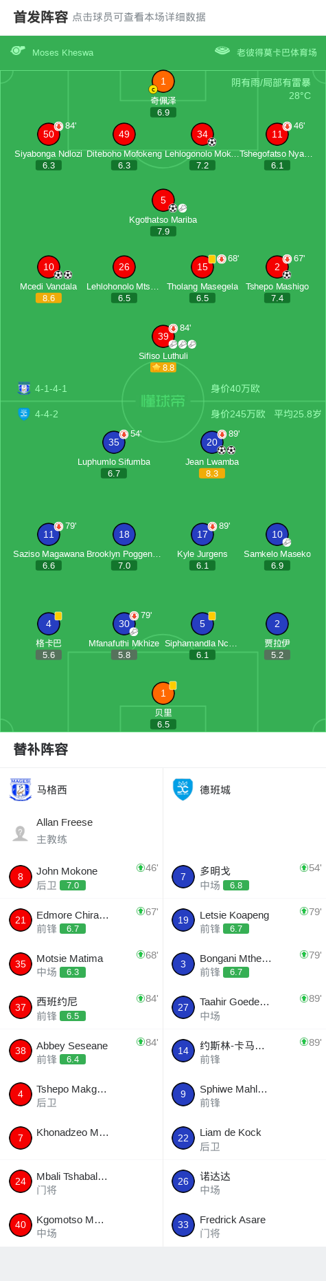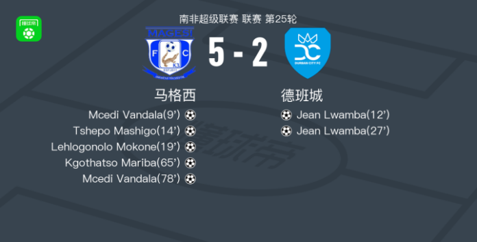 北京时间4月19日南非超级联赛 联赛 第25轮,马格西主场对阵德班城。马格西Mcedi Vandala梅开二度,Tshepo Mashigo破门,Lehlogonolo Mokone破门,Kgothatso Mariba破门。德班城Jean Lwamba梅开二度。最终比分马格西 5–2 德班城。