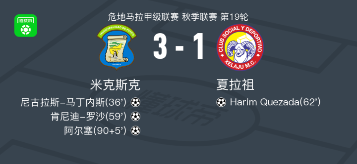 北京时间4月12日危地马拉甲级联赛 秋季联赛 第19轮,米克斯克主场对阵夏拉祖。米克斯克尼古拉斯-马丁内斯破门,肯尼迪-罗沙破门,阿尔塞破门。夏拉祖Harim Quezada破门。最终比分米克斯克 31 夏拉祖。