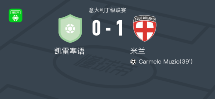 北京时间4月12日意大利丁级联赛,凯雷塞语主场对阵米兰。米兰Carmelo Muzio破门。最终比分凯雷塞语 01 米兰。