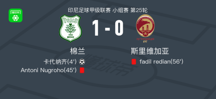 北京时间4月19日印尼足球甲级联赛 小组赛 第25轮,棉兰主场对阵斯里维加亚。棉兰卡代纳齐破门。最终比分棉兰 1–0 斯里维加亚。