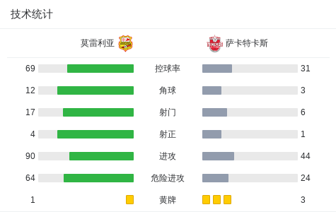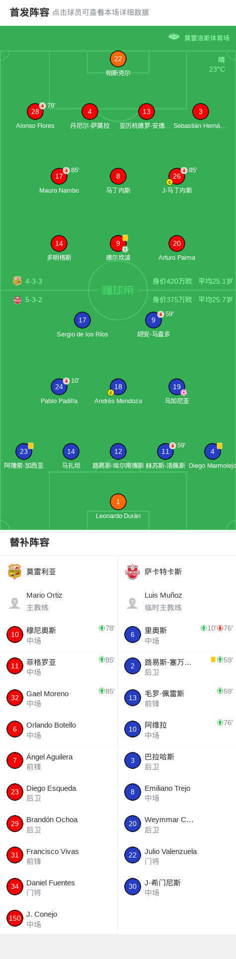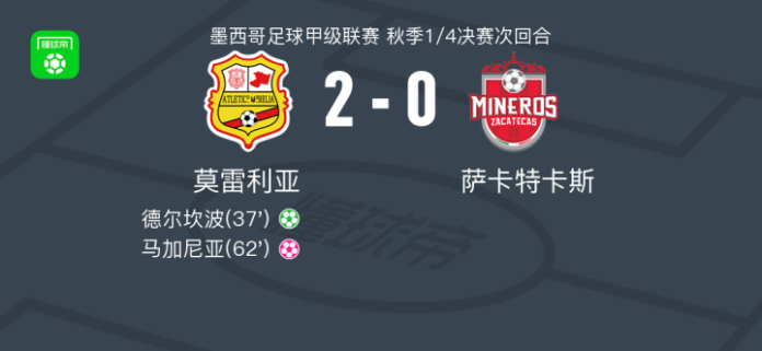 北京时间4月26日墨西哥足球甲级联赛 秋季1/4决赛次回合,莫雷利亚主场对阵萨卡特卡斯。莫雷利亚德尔坎波破门。萨卡特卡斯马加尼亚自摆乌龙。最终比分莫雷利亚 2–0 萨卡特卡斯。两回合总比分莫雷利亚2-3萨卡特卡斯。