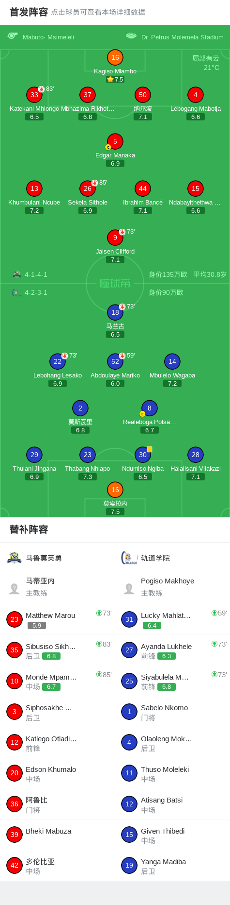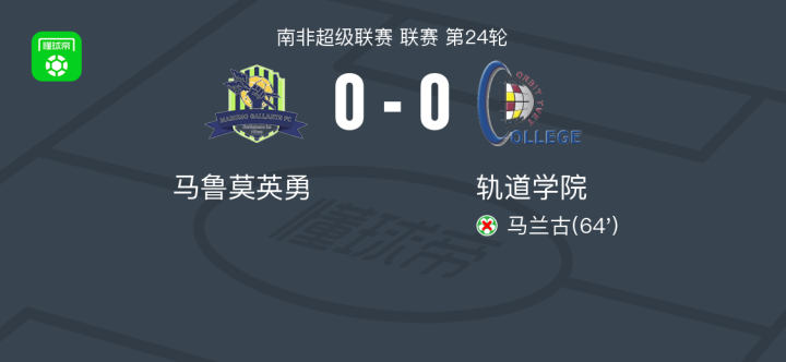 马鲁莫英勇0-0轨道学院,双方互交白卷 足球资讯 发布时间: 2026年4月13日 阅读时间: 少于1 分钟 FacebookXPinterestWhatsApp 马鲁莫英勇0-0轨道学院,双方互交白卷 北京时间4月12日南非超级联赛 联赛 第24轮,马鲁莫英勇主场对阵轨道学院。最终比分马鲁莫英勇 0–0 轨道学院。 点击查看本场比赛详细数据>> 点击查看南非超完整积分榜>> 精彩瞬间 第64分钟,轨道学院球员马兰古将点球罚丢。 球队阵容 技术统计 FacebookXPinterestWhatsApp 1823100https://1823100.com 红单推荐 007 意杯 国际米兰vs科莫 红单推荐 2026年4月21日 005 西甲 毕尔巴鄂竞技vs奥萨苏纳 红单推荐 2026年4月21日 001 意甲 莱切vs佛罗伦萨 红单推荐 2026年4月20日 003 英超 水晶宫vs西汉姆联 红单推荐 2026年4月20日 019 英超 曼城vs阿森纳 红单推荐 2026年4月19日 热门资讯 004 欧冠 巴萨vs马竞 红单推荐 2026年4月8日 三人20+!火箭21分逆转太阳7连胜 KD24分阿门22+11+8 篮球资讯 2026年4月8日 007 意杯 国际米兰vs科莫 红单推荐 2026年4月21日 马卡:巴萨进入“换代期”,五位球员或将离队 足球资讯 2026年4月21日 记者:尤文希望2500万至3000万欧签回穆阿尼 足球资讯 2026年4月22日