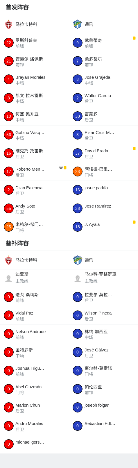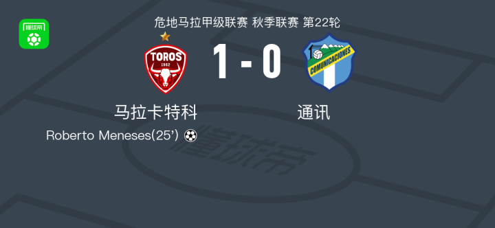 北京时间4月27日危地马拉甲级联赛 秋季联赛 第22轮,马拉卡特科主场对阵通讯。马拉卡特科Roberto Meneses破门。最终比分马拉卡特科 1–0 通讯。