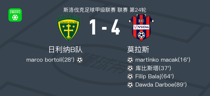 北京时间4月12日斯洛伐克足球甲级联赛 联赛 第24轮,日利纳B队主场对阵莫拉斯。日利纳B队marco bortoli破门。莫拉斯martinko macak破门,库比斯塔破门,Filip Balaj破门,Dawda Darboe破门。最终比分日利纳B队 1–4 莫拉斯。