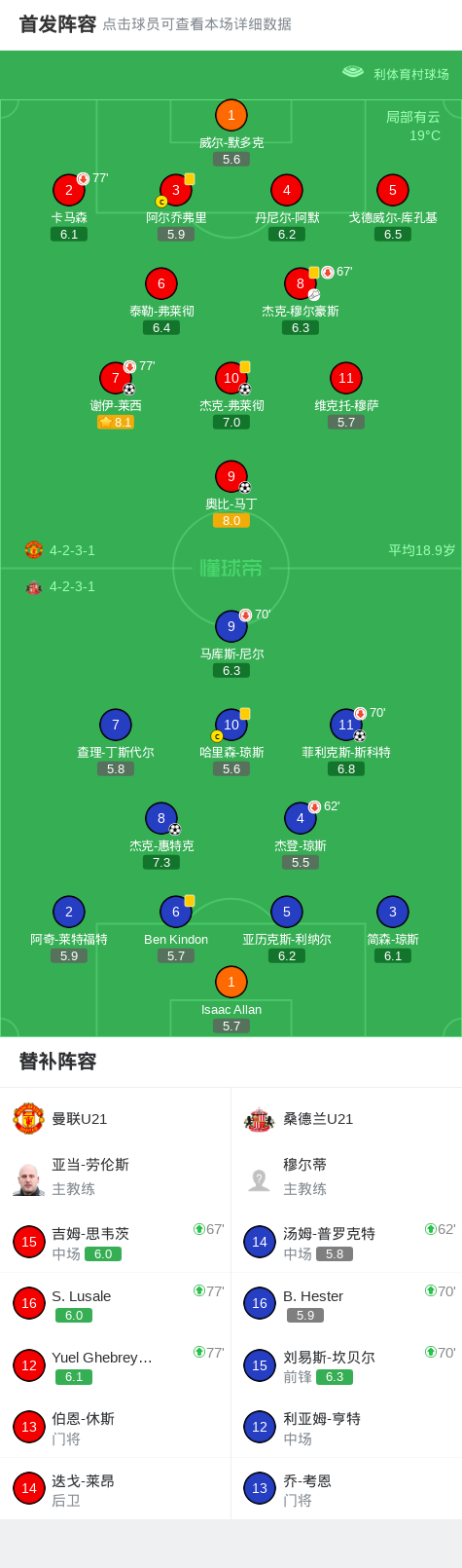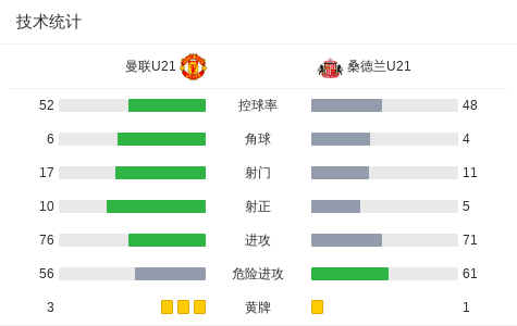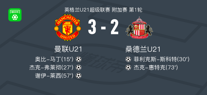 北京时间4月26日英格兰U21超级联赛 附加赛 第1轮,曼联U21主场对阵桑德兰U21。曼联U21奥比-马丁破门,杰克-弗莱彻破门,谢伊-莱西破门。桑德兰U21菲利克斯-斯科特破门,杰克-惠特克破门。最终比分曼联U21 3–2 桑德兰U21。