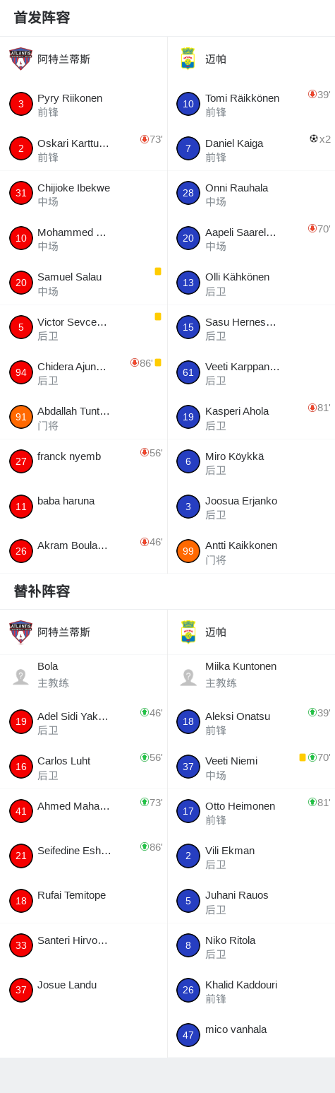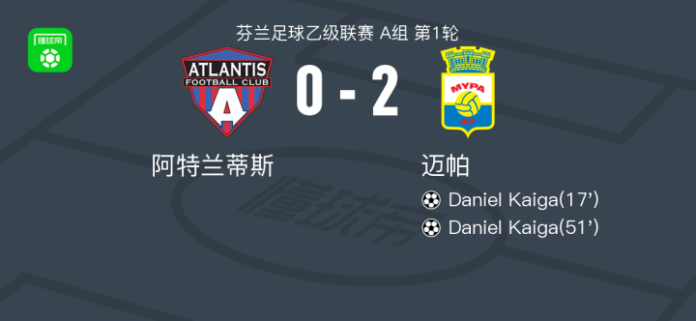 迈帕2-0阿特兰蒂斯,Daniel Kaiga包办2球 足球资讯 发布时间: 2026年4月18日 阅读时间: 少于1 分钟 FacebookXPinterestWhatsApp 迈帕2-0阿特兰蒂斯,Daniel Kaiga包办2球 北京时间4月18日芬兰足球乙级联赛 A组 第1轮,阿特兰蒂斯主场对阵迈帕。迈帕Daniel Kaiga梅开二度。最终比分阿特兰蒂斯 0–2 迈帕。 点击查看本场比赛详细数据>> 精彩瞬间 第17分钟,迈帕球员Daniel Kaiga打入一球。 第51分钟,迈帕球员Daniel Kaiga打入一球。 球队阵容 技术统计 FacebookXPinterestWhatsApp 1823100https://1823100.com 红单推荐 023 英超 阿森纳vs纽卡斯尔 红单推荐 2026年4月25日 016 英超 狼队vs热刺 红单推荐 2026年4月25日 013 英超 桑德兰vs诺丁汉 红单推荐 2026年4月24日 014 西甲 贝蒂斯vs皇马 红单推荐 2026年4月24日 005 西甲 巴列卡诺vs西班牙人 红单推荐 2026年4月23日 热门资讯 005 西甲 巴列卡诺vs西班牙人 红单推荐 2026年4月23日 003 西甲 莱万特vs塞维利亚 红单推荐 2026年4月23日 016 英超 狼队vs热刺 红单推荐 2026年4月25日 023 英超 阿森纳vs纽卡斯尔 红单推荐 2026年4月25日 三人20+!火箭21分逆转太阳7连胜 KD24分阿门22+11+8 篮球资讯 2026年4月8日