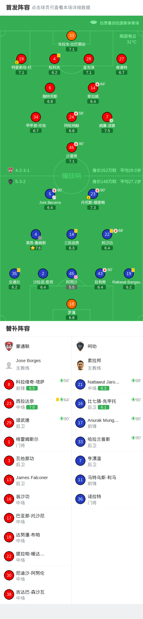北京时间4月18日泰国超级联赛 联赛 第20轮,蒙通联主场对阵呵叻。蒙通联威廉-波普破门。呵叻莱昂-詹姆斯破门,阿努沙自摆乌龙。最终比分蒙通联 2–1 呵叻。