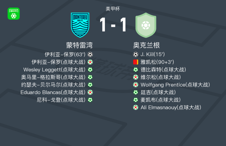 北京时间4月26日美甲杯,蒙特雷湾对阵奥克兰根。蒙特雷湾伊利亚-保罗破门。奥克兰根J. Kiil破门。最终比分蒙特雷湾 1–1 奥克兰根。