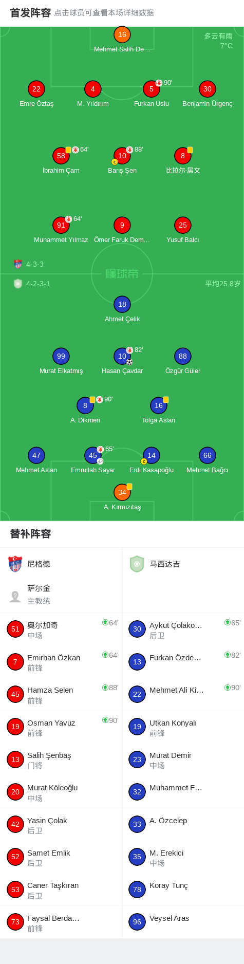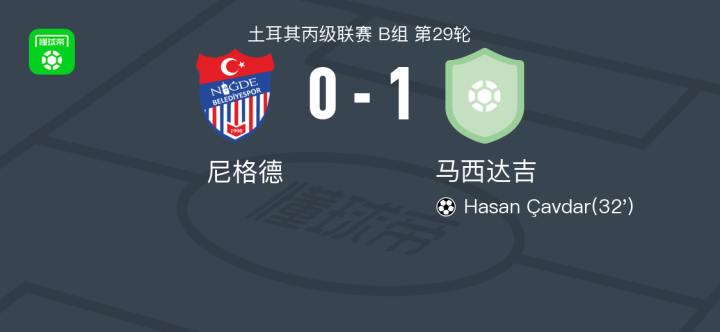 马西达吉1-0尼格德,Hasan Çavdar制胜球 足球资讯 发布时间: 2026年4月13日 阅读时间: 少于1 分钟 FacebookXPinterestWhatsApp 马西达吉1-0尼格德,Hasan Çavdar制胜球 北京时间4月12日土耳其丙级联赛 B组 第29轮,尼格德主场对阵马西达吉。马西达吉Hasan Çavdar破门。最终比分尼格德 0–1 马西达吉。 点击查看本场比赛详细数据>> 精彩瞬间 第32分钟,马西达吉球员Emrullah Sayar助攻Hasan Çavdar打入一球。 球队阵容 FacebookXPinterestWhatsApp 1823100https://1823100.com 红单推荐 021 西甲 奥萨苏纳vs塞维利亚 红单推荐 2026年4月26日 013 英足总杯 切尔西(中)vs利兹联 红单推荐 2026年4月26日 023 英超 阿森纳vs纽卡斯尔 红单推荐 2026年4月25日 016 英超 狼队vs热刺 红单推荐 2026年4月25日 013 英超 桑德兰vs诺丁汉 红单推荐 2026年4月24日 热门资讯 三人20+!火箭21分逆转太阳7连胜 KD24分阿门22+11+8 篮球资讯 2026年4月8日 约基奇第198次三双!掘金大胜灰熊豪取10连胜 穆雷26+7+5 篮球资讯 2026年4月9日 004 欧冠 巴萨vs马竞 红单推荐 2026年4月8日 002 欧协联 巴列卡诺vs雅典AEK 红单推荐 2026年4月9日 003 欧冠 利物浦vs巴黎圣日耳曼 红单推荐 2026年4月14日